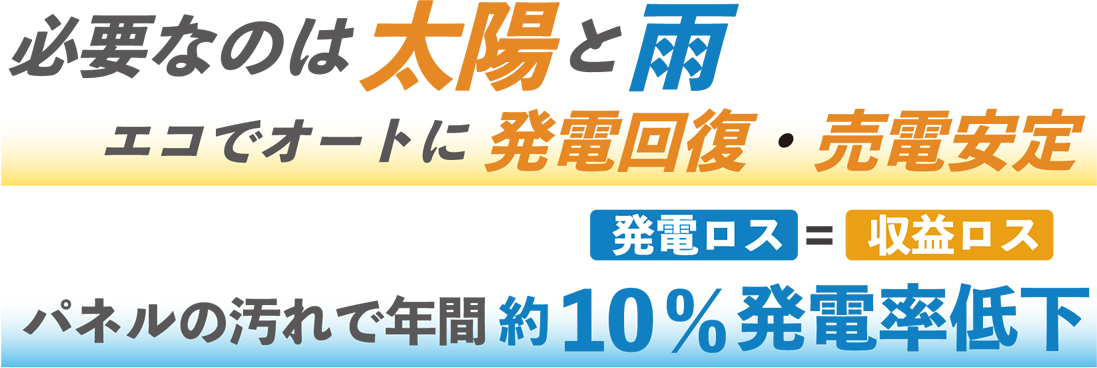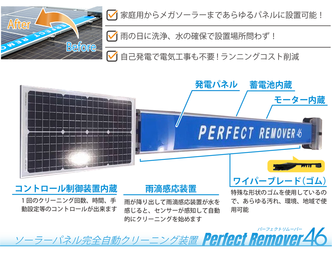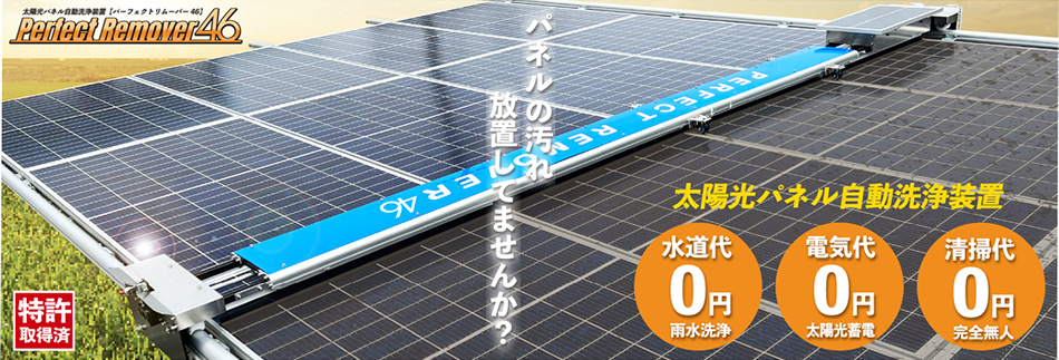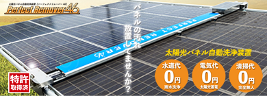 太陽光発電設備は、ソーラーパネルに付着する汚れ(ほこり・水垢・鳥の糞・PM2.5・黄砂・花粉等…)により発電効率が低下します。ソーラーパネル洗浄には人手と時間と水道代等ランニングコストが発生しますが、Perfect Remover46(パーフェクトリムーバー46)により洗浄を自動化、雨水を利用する為、水源や水配管もいらず大幅なコストダウンが図れます。